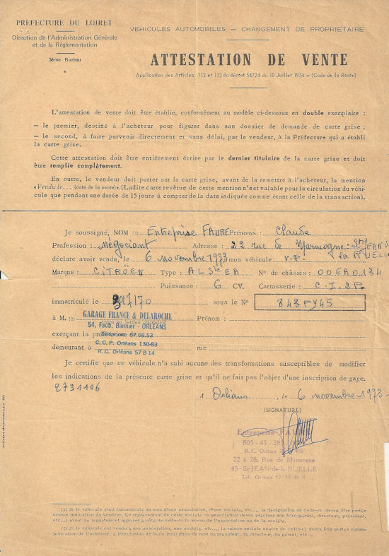No. 134 was purchased ’86 at the Orléans concessionaire France et Delaroche, where it was probably part of their own collection as they bought it already in ’73 from M.Faure of St. Jean de la Ruelle, next to Orléans.